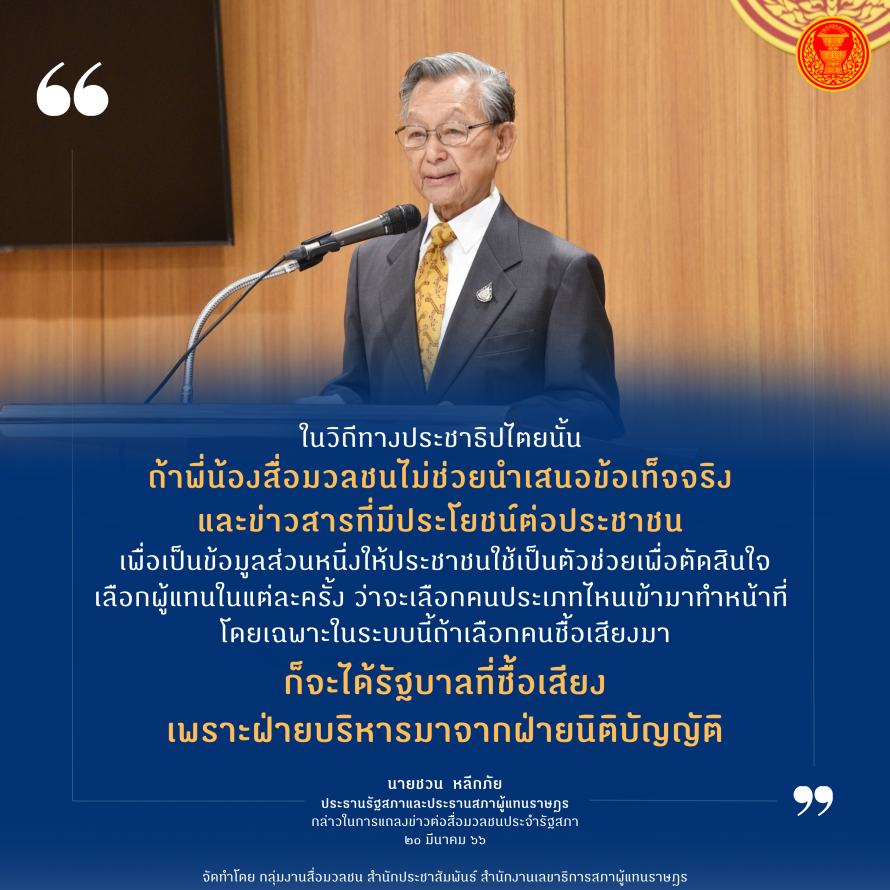 วันจันทร์ที่ 20 มีนาคม 2566 เวลา 09.45 นาฬิกา ณ ห้องแถลงข่าว ชั้น 1 อาคารรัฐสภา นายชวน หลีกภัย ประธานรัฐสภาและประธานสภาผู้แทนราษฎร แถลงข่าวต่อสื่อมวลชนมีความภูมิใจที่สภาฯ อยู่มาครบ 4 ปี ทำหน้าที่ฝ่ายนิติบัญญัติครบถ้วน