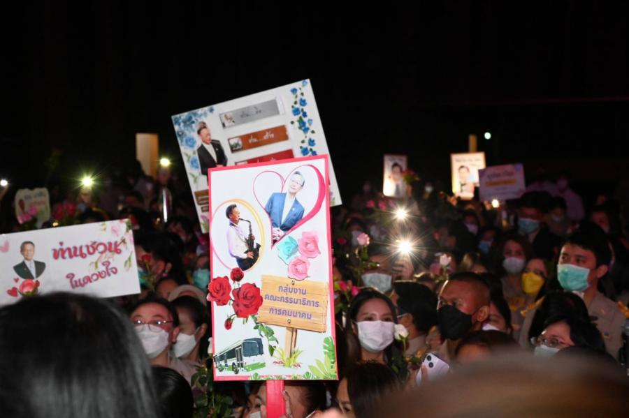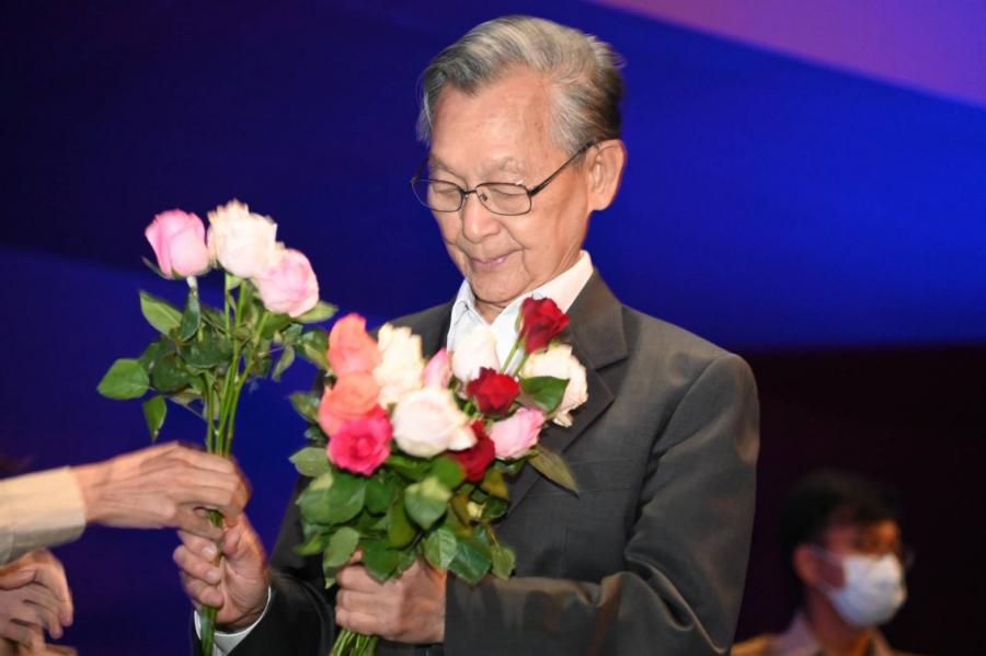 "มุทิตา คารวะ มนะน้อม ผู้ถึงพร้อม ธรรมนิยม พรหมวิหาร อีกศาสตร์ศิลป์ เชิงชั้น ขั้นเชี่ยวชาญ คือประธาน ผู้ครบถ้วน "ชวน หลีกภัย" สี่ปีผ่าน งานยิ่งใหญ่ ให้รำลึก สร้างสำนึก สุจริต คิดโปร่งใส เป็นรากฐาน เพิ่มคุณค่า สภาไทย ประจักษ์ใจ น้อมมนัส กตเวที ถึงวันนี้ จำจบ ครบวาระ ขอพรพระ รัตนะเพิ่ม เสริมราศี แด่ผู้เปี่ยม คุณงาม และความดี ปูชนีย์ ที่สัตย์ซื่อ ชื่อนายชวน"