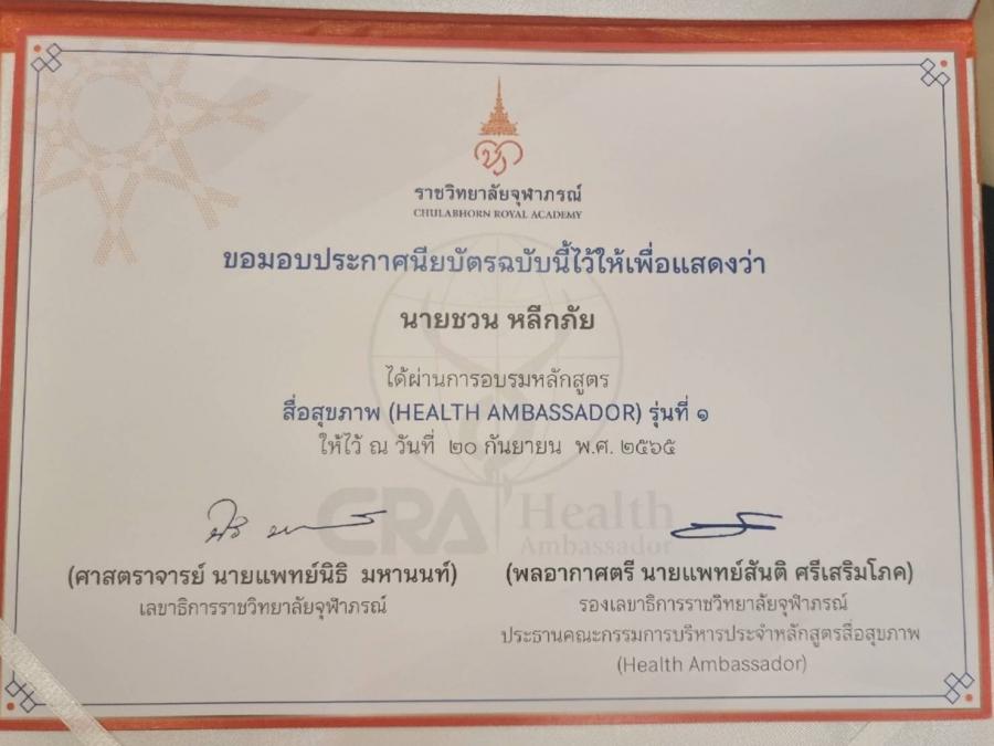 ในการนี้ นายชวน หลีกภัย ประธานรัฐสภาและประธานสภาผู้แทนราษฎร เข้ารับพระราชทานเข็มวิทยฐานะและประประกาศนียบัตรสำหรับผู้ผ่านการอบรมหลักสูตรสื่อสุขภาพ (Health Ambassador) รุ่นที่ 1
